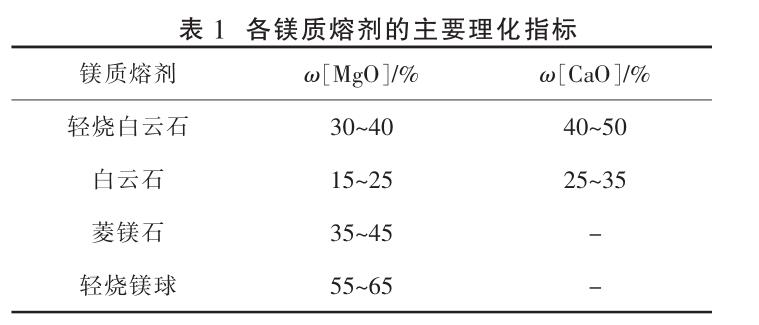 各鎂質(zhì)熔劑的主要理化指標(biāo)如表 1 所示。 鎂質(zhì)熔劑的造渣機(jī)理分析如下。