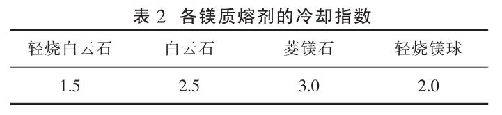 轉(zhuǎn)爐煉鋼采用何種鎂質(zhì)熔劑取決于各鎂質(zhì)材料的冶金效果, 其中最主要的是由于各物料的冷卻效果不同,因此對轉(zhuǎn)爐熱平衡的影響差異較大,從而影響廢鋼的加入。 由于白云石、菱鎂石在轉(zhuǎn)爐內(nèi)融化需要大量熱,因此其溫降較大。 若規(guī)定廢鋼的冷卻效應(yīng)為 1.0 ,則跟蹤分析轉(zhuǎn)爐冶煉過程各鎂質(zhì)熔劑的實際溫降可得出其冷卻指數(shù),見表 2 。