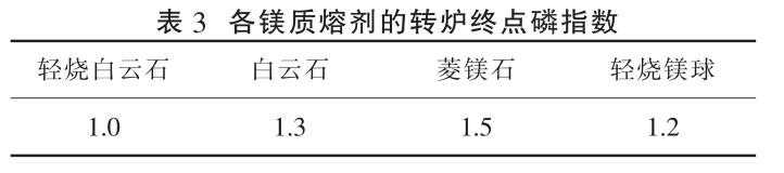 若將對轉(zhuǎn)爐脫磷影響最小的輕燒白云石作為鎂質(zhì)造渣劑的爐次終點平均磷含量的基礎(chǔ), 其它鎂質(zhì)熔劑平均轉(zhuǎn)爐終點磷含量與之對比作為轉(zhuǎn)爐終點磷指數(shù), 則跟蹤分析轉(zhuǎn)爐冶煉過程各鎂質(zhì)熔劑的實際轉(zhuǎn)爐終點磷含量, 可得出各鎂質(zhì)熔劑的轉(zhuǎn)爐終點磷指數(shù),如表 3 所示。 終點磷指數(shù)越大,轉(zhuǎn)爐平均終點磷含量越高。
