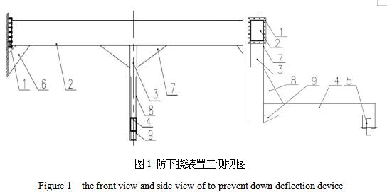 圖1為安裝在中間罐車上的防下?lián)涎b置。它通過件2(橫梁)與件4(支撐梁)連接在中間罐車上;當(dāng)中間罐車上的中間包因重力向下彎曲變形時,它會受到件4的支撐,件4(支撐梁)通過件3(立柱)和件2 ,將力傳遞至件5(車輪),最終傳遞至中間罐車的軌道上。