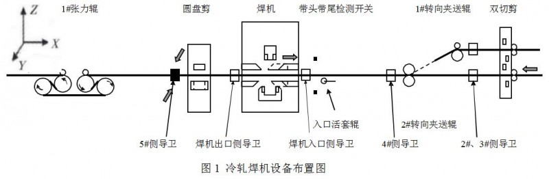 冷軋焊機(jī)設(shè)備布置圖如圖1所示。焊機(jī)主要設(shè)備有入口活套輥、帶頭帶尾檢測開關(guān)、焊機(jī)入出口側(cè)導(dǎo)衛(wèi)、切邊剪、入出口夾鉗、沖孔設(shè)備、激光頭、喂絲設(shè)備等。
