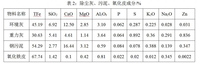 通過對篦條糊堵物進行取樣成份分析發(fā)現(xiàn)粘結(jié)物中堿金屬含量偏高,其中K2O、Na2O含量尤其偏高,由此分析判斷正是由于除塵灰、污泥等的直接配加、循環(huán)使用造成了有害元素的不斷富集。具體除塵灰、污泥、氧化皮成份見下表2。