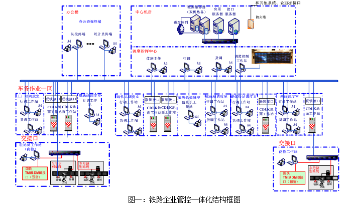 運(yùn)輸企業(yè)管控一體化是以車號(hào)識(shí)別技術(shù)為基礎(chǔ)、無線平面調(diào)車為信息傳輸手段、道口集中管控為支撐、調(diào)度集中監(jiān)控為中心、鐵路運(yùn)輸貨運(yùn)管理系統(tǒng)為核心的一整套信息化系統(tǒng)。該系統(tǒng)可以把原各站、段、區(qū)的生產(chǎn)組織人員集中到一個(gè)(或分專業(yè)整合)集中控制中心,對企業(yè)總的物流任務(wù)進(jìn)行統(tǒng)一管控,旨在把原系統(tǒng)中的分區(qū)域編制計(jì)劃、分站段執(zhí)行、各自為站的管理模式,集中統(tǒng)一到中心,統(tǒng)一計(jì)劃、統(tǒng)一辦理進(jìn)路、統(tǒng)一進(jìn)行管控的生產(chǎn)組織模式,取消了各站、段、區(qū)的分工,把原來依靠人工進(jìn)行的調(diào)度作業(yè)計(jì)劃編制、調(diào)車作業(yè)統(tǒng)計(jì)、調(diào)度進(jìn)路辦理等多項(xiàng)業(yè)務(wù),整合到一個(gè)信息化系統(tǒng)進(jìn)行管控。最大限度地減少了人員的重復(fù)傳輸錄入各類信息造成的失誤和不確定性,提高了整個(gè)系統(tǒng)的準(zhǔn)確性。大幅度提高了安全生產(chǎn)作業(yè)效率,而且提高作業(yè)流程的優(yōu)化可以大幅度的壓縮路車停時(shí)費(fèi)用,經(jīng)濟(jì)與社會(huì)效益十分顯著。
