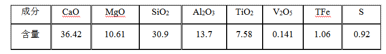 承鋼高爐渣主要化學(xué)成分為CaO、 MgO 、SiO2、Al2O3、TiO2、V2O5、TFe 、S 等,典型成分如表1所示。