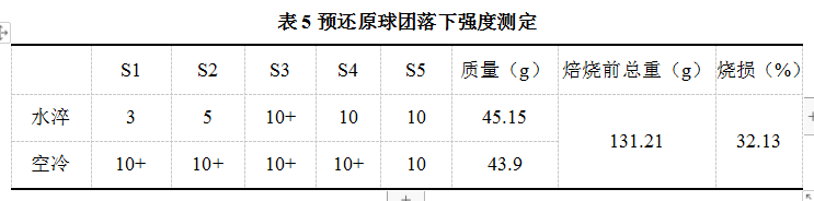 從焙燒后球團強度結(jié)果來看,水淬后的球團強度稍差,空冷球團有著很高的強度,落下次數(shù)均達10以上,完全能滿足實際生產(chǎn)中倒運的要求。因此在預還原球團的冷卻工藝設計時,應根據(jù)工業(yè)應用實際情況,為了避免空冷造成預還原球團表層二次氧化,適當?shù)目紤]采用間接冷卻工藝,不僅有利于球團提高落下強度,更是對改善作業(yè)環(huán)境有很大的幫助。