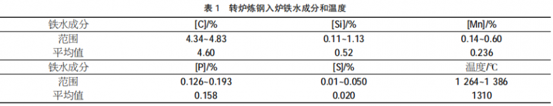 轉(zhuǎn)爐煉鋼入爐鐵水主要成分見表 1。入爐鐵水硅含量波動較大,范圍在 0.11%~1.13%,平均約為0.52%,轉(zhuǎn)爐冶煉過程溫度有較大富余;鐵水平均磷含量約為 0.158%,鐵水磷含量較高,因此,轉(zhuǎn)爐冶煉過程脫磷難度大幅增加,脫磷也成為轉(zhuǎn)爐煉鋼的最主要難點之一。