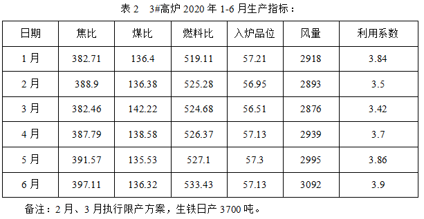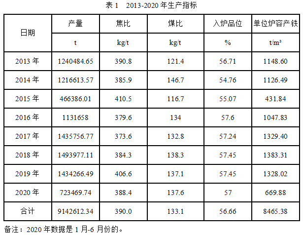 3#高爐于2012年11月10日開爐,實現(xiàn)一次投產(chǎn)成功,投產(chǎn)后,順行狀態(tài)良好,冶煉強(qiáng)度逐步提高,但自投產(chǎn)至2016年因各方面原先各項指標(biāo)偏低。2016年底至今,高爐穩(wěn)定順行,各項經(jīng)濟(jì)、技術(shù)指標(biāo)逐漸提高,單位爐容產(chǎn)鐵8465.38t/m³,預(yù)計按計劃到2021年10月停產(chǎn),將達(dá)長壽高爐標(biāo)準(zhǔn)(2015年環(huán)保限產(chǎn)停爐,3#爐3月停爐,2015年8月份開爐生產(chǎn)。高爐自投產(chǎn)至今,無大中修)。3#高爐2013-2020年生產(chǎn)指標(biāo)見表1。