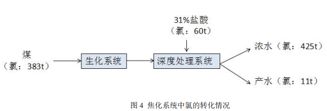 1) 焦化系統(tǒng)氯元素,86.5%來自于原料煤,13.5%來自于焦化廢水處理過程投加 31%濃度的鹽酸(HCl),最終有 97.47%轉(zhuǎn)化到焦化廢水。