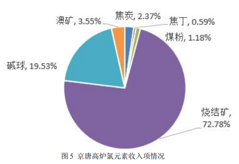 收入項(xiàng):按照燒結(jié)礦配料中礦粉和固廢等燒結(jié)料中 Cl 含量收入情況進(jìn)行測(cè)算,按照帶入氯元素比例排序前五名分別為:焦化酚氰廢水 24.69%→秘魯球團(tuán)粉 17.23%→高爐旋風(fēng)除塵灰 14.11%→環(huán)境除塵灰 7.85% →麥克粉 6.19%→高爐返礦 5.87%。