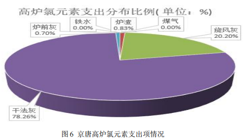其中高爐鐵水、高爐煤氣未檢測(cè)氯元素,在分布圖中未做考慮。在支出項(xiàng)中,主要為除塵灰?guī)С雎仍兀L(fēng)灰占 20.20%,干法灰占 78.26%。