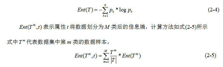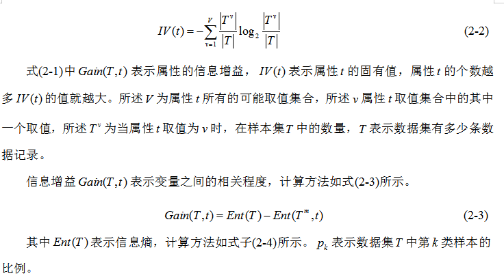 本文采用C4.5算法中相關(guān)性的度量方法信息增益率來計算不同屬性對光整機用輥型號的影響程度,信息增益率是由信息增益與屬性固有值的比值得來的。單純的依賴信息增益作為分類特征會出現(xiàn)一些問題,如:數(shù)據(jù)集中有編號一列,則編號的信息熵為0,這樣得到編號的信息增益是最大的,但很顯然這樣分類是沒有意義的。因此引入信息增益率,很好的解決了這個問題。信息增益率、屬性固有值的計算方法分別如式(2-1)、(2-2)所示。