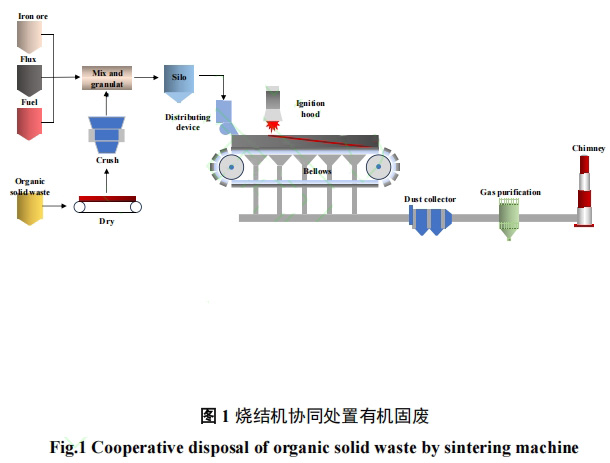 鐵礦燒結(jié)是鋼鐵生產(chǎn)過程中主要的煉鐵原料生產(chǎn)工藝,不同成分的鐵礦粉和熔劑在高溫條件下轉(zhuǎn)變?yōu)槌煞志?、性能穩(wěn)定的燒結(jié)礦。燒結(jié)工序協(xié)同處置有機固廢時對產(chǎn)品質(zhì)量的影響相對較小,并且燒結(jié)工序污染物排放受到重點監(jiān)控,具有完善的污染治理設(shè)施,可以對有機固廢處置過程的二次污染進行協(xié)同控制[8]。
