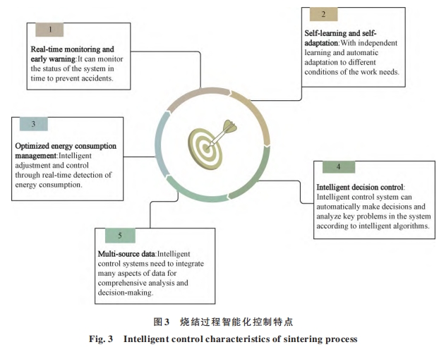 智能化控制是一種新型的自動(dòng)化控制方式,其基于先進(jìn)的技術(shù)和算法,融合大數(shù)據(jù)、傳感器、自適應(yīng)控制以及人工智能等多種技術(shù),能夠?qū)崿F(xiàn)對(duì)系統(tǒng)參數(shù) 、操作模式和決策過程的智能化管理和優(yōu)化[13]。智能化控制的特點(diǎn)包括自學(xué)習(xí)與自適應(yīng)、實(shí)時(shí)監(jiān)測(cè)和預(yù)警、最優(yōu)化能耗管理、數(shù)據(jù)多源化及智能決策控制,具體特點(diǎn)如圖 3 所示。這種控制方式通過集成和協(xié)同運(yùn)用各種技術(shù)手段,達(dá)到提高系統(tǒng)的穩(wěn)定性、效率和可靠性的目的,有助于實(shí)現(xiàn)更高效、可持續(xù)和安全綠色化的生產(chǎn)。智能化控制系統(tǒng)在燒結(jié)過程中可實(shí)現(xiàn)點(diǎn)火、料層狀態(tài)監(jiān)控、終點(diǎn)控制以及燒結(jié)礦性能檢測(cè)等方面的智能化,進(jìn)而提高燒結(jié)過程中的生產(chǎn)效率、產(chǎn)品質(zhì)量以及能耗利用率,使燒結(jié)過程更加智能、高效和穩(wěn)定[14]。不僅在燒結(jié)方面,智能化控制在工業(yè)生產(chǎn)和自動(dòng)化領(lǐng)域已成為一大新興發(fā)展趨勢(shì),智能化冶金將推動(dòng)冶金產(chǎn)業(yè)向著更高效、安全和可持續(xù)的方向發(fā)展,這也提升了整個(gè)冶金生產(chǎn)鏈的智能化水平和競(jìng)爭(zhēng)力[15] 。