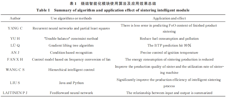 LAITINEN P J 等[23] 基于前饋神經(jīng)網(wǎng)絡(luò)建立了數(shù)據(jù)驅(qū)動(dòng)的建模方法,研究操作參數(shù)對(duì)燒結(jié)礦質(zhì)量、生產(chǎn)率以及燃料消耗的影響。模型能夠很好地描述輸出變化,通過分析輸入變量,能夠預(yù)測(cè)輸出結(jié)果并總結(jié)輸入與輸出之間的相互作用關(guān)系。近些年有關(guān)燒結(jié)智能化模塊 使用算法及應(yīng)用效果總結(jié)見表1。
