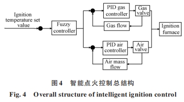 點(diǎn)火強(qiáng)度是指混合料單位面積獲得的熱能,其取決于導(dǎo)熱系數(shù)、溫度分布以及加熱時(shí)間和方式等。高點(diǎn)火強(qiáng)度會(huì)引起原料表面焦化和氧化等問題。因此,應(yīng)根據(jù)實(shí)際情況優(yōu)化和調(diào)整點(diǎn)火強(qiáng)度,以適應(yīng)不同工況[26]。燃料配給量對(duì)點(diǎn)火溫度具有重要影響,其直接關(guān)系到控制每個(gè)環(huán)節(jié)的溫度。因此,實(shí)際生產(chǎn)中更需要一種能夠動(dòng)態(tài)調(diào)節(jié)點(diǎn)火溫度的智能控制裝置,以適應(yīng)不同環(huán)境下的需求[27] 。李萬宏[25] 提出了一種點(diǎn)火溫度模糊 PID(比例-積分-微分控制器)控制器,該控制器可以根據(jù)不同環(huán)境動(dòng)態(tài)調(diào)整點(diǎn)火溫度的設(shè)定值,從而實(shí)現(xiàn)點(diǎn)火過程的自適應(yīng)控制,其被應(yīng)用在燒結(jié)點(diǎn)火智能控制系統(tǒng)中,總體結(jié)構(gòu)如圖 4 所示。點(diǎn)火時(shí)間是指混合料在點(diǎn)火器段內(nèi)的停留時(shí)間,其取決于燒結(jié)設(shè)備的類型、燒結(jié)原料性質(zhì)和燒結(jié)工藝參數(shù)的選擇,此外,控制燃料氣體的空燃比(空氣和燃料比例)有助于避免煤氣不充分燃燒或浪費(fèi)資源[27] 。