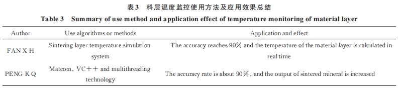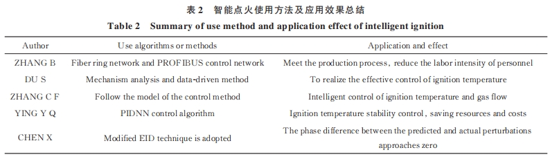 該系統(tǒng)在某鋼鐵廠投入運(yùn)行后,其點(diǎn)火溫度可以實(shí)現(xiàn)穩(wěn)定控制,進(jìn)而節(jié)約了人工成本和提高了資源利用率。CHEN X 等[32] 提出一種基于修正的 EID(電子識(shí)別技術(shù))燒結(jié)點(diǎn)火控制模型,同時(shí)還開發(fā)了一種迭代子空間建模方法來預(yù)測(cè)時(shí)間延遲和估計(jì)模型參數(shù),通過一個(gè)額外的延遲元件,使得 EID 預(yù)測(cè)和實(shí)際擾動(dòng)的相位差趨近于零。通過模擬驗(yàn)證了該方法的可行性,為點(diǎn)火智能控制的研究提供了新的研究方法。智能點(diǎn)火使用方法及應(yīng)用效果總結(jié)見表 2。