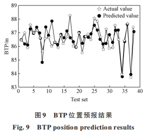 由于以上 BTP 判斷方法都會(huì)有很大的滯后性,因此要想提高燒結(jié)穩(wěn)定性和燒結(jié)礦產(chǎn)質(zhì)量就需要對(duì) BTP 進(jìn)行提前預(yù)報(bào)。WU M 等[45] 運(yùn)用灰色理論和反向傳播神經(jīng)網(wǎng)絡(luò)建立了 BTP 預(yù)測(cè)模型,并利用模糊控制、預(yù)測(cè)控制和開關(guān)控制構(gòu)建了混合模糊控制器以實(shí)現(xiàn)對(duì) BTP 的準(zhǔn)確控制。通過實(shí)踐表明,該系統(tǒng)有效地抑制了 BTP 的波動(dòng),提高了燒結(jié)礦的產(chǎn)質(zhì)量,而且也保障了生產(chǎn)的安全性。汪森輝等[46] 提出了一種基于改進(jìn)的 AdaBoost. RS(自適應(yīng)增強(qiáng)的推薦系統(tǒng))算法和極限學(xué)習(xí)機(jī)相結(jié)合的 BTP 位置預(yù)測(cè)集成算法模型。該模型的預(yù)測(cè)效果如圖 9 所示(該圖源數(shù)據(jù)來自參考文獻(xiàn)[46])。研究結(jié)果表明,當(dāng)絕對(duì)誤差小于 1. 6 mm 時(shí),該模型的結(jié)果命中率高達(dá) 97. 4%,相較于傳統(tǒng)方法,該模型大幅度提高了 BTP 位置預(yù)測(cè)的準(zhǔn)確性。DU S 等[47] 提出一種利用模糊時(shí)間序列的 BTP 預(yù)測(cè)模型,該模型通過調(diào)整因子將響應(yīng)預(yù)測(cè)模型和混合預(yù)測(cè)模型組合而來 。 通過實(shí)際生產(chǎn)的檢驗(yàn)表明,該模型優(yōu)于其他模型的性能,其預(yù)測(cè)性能更加顯著。同時(shí),該模型也為燒結(jié)過程的 BTP 預(yù)測(cè)奠定了基礎(chǔ)。