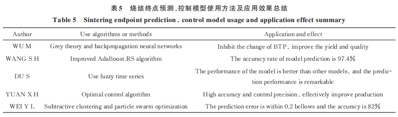鑒于燒結(jié)過程的復(fù)雜、時(shí)變和非線性特征,傳統(tǒng)控制模型已難以滿足生產(chǎn)需求,因此,學(xué)術(shù)界開始探索將智能算法和 BTP 控制模型相融合,以提高模型性能。袁曉紅等[48]使用最優(yōu)控制算法建立了燒結(jié)過程的最優(yōu)控制模型,用于控制燒結(jié)過程中的終點(diǎn)溫度和點(diǎn)火強(qiáng)度。該模型采用了神經(jīng)網(wǎng)絡(luò)進(jìn)行建模,其結(jié)構(gòu)如圖 10 所示。而且,其自適應(yīng)能力強(qiáng),能在不同工作條件下保證高準(zhǔn)確性和高控制度,燒結(jié)礦產(chǎn)量得到有效的提高。此外,魏玉龍[49] 運(yùn)用減法聚類和粒子群優(yōu)化方法對(duì) PBF(可編程布局結(jié)構(gòu))神經(jīng)網(wǎng)格進(jìn)行優(yōu)化,并建立了 BTP 預(yù)測(cè)模型,試驗(yàn)表明該模型的預(yù)測(cè)誤差在 0. 2 個(gè)風(fēng)箱范圍 內(nèi)的準(zhǔn)確性達(dá)到 82%。同時(shí),該團(tuán)隊(duì)還使用最小二乘法創(chuàng)建了辨識(shí)模型,并設(shè)計(jì)了變量域模糊控制器來實(shí)現(xiàn)對(duì) BTP 的可靠控制。有關(guān)燒結(jié)終點(diǎn)預(yù)測(cè)、控制模型使用方法及應(yīng)用效果總結(jié)見表 5。