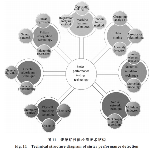燒結(jié)礦性能預(yù)測(cè)主要使用的技術(shù)包括機(jī)器學(xué)習(xí)、數(shù)值模擬、數(shù)據(jù)挖掘和物理模型等,燒結(jié)礦性能檢測(cè)技術(shù)結(jié)構(gòu)如圖 11 所示。為了提高燒結(jié)礦的產(chǎn)質(zhì)量,可以運(yùn)用各種先進(jìn)技術(shù)對(duì)其性能進(jìn)行預(yù)測(cè)、優(yōu)化和模擬[52] 。其中,機(jī)器學(xué)習(xí)通過歷史數(shù)據(jù)構(gòu)建模型以預(yù)測(cè)未來燒結(jié)礦的性能;數(shù)據(jù)挖掘算法則能夠從歷史數(shù)據(jù)中提取有用信息;模式識(shí)別可識(shí)別燒結(jié)礦性能變化趨勢(shì)。此外,遺傳算法、數(shù)值模擬、神經(jīng)網(wǎng)絡(luò)技術(shù)和物理模型也可被應(yīng)用于優(yōu)化燒結(jié)礦性能參數(shù)和模擬燒結(jié)礦的性能變化[53] ??傊?,這些技術(shù)的應(yīng)用可以顯著提高燒結(jié)礦性能預(yù)測(cè)準(zhǔn)確性,并提高其整體產(chǎn)質(zhì)量水平。