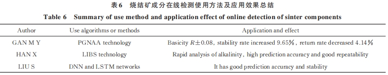燒結(jié)礦成分在線檢測(cè)主要使用的技術(shù)包括PGNAA(瞬發(fā) γ 射線中子活化分析)、LIBS(激光誘導(dǎo)擊穿光譜)技術(shù)以及基于 DNN(深度神經(jīng)網(wǎng)絡(luò))和LSTM(長(zhǎng)短期記憶網(wǎng)絡(luò))的在線監(jiān)測(cè)等[55]。這些 技術(shù)都可以用來快速、準(zhǔn)確地分析燒結(jié)礦的成分。