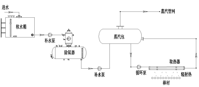 軟水經(jīng)除氧器去除水中溶解氧后進(jìn)入蒸汽包,蒸汽包中的高溫高壓水經(jīng)強(qiáng)制循環(huán)后輸送至各取熱器。取熱器懸掛于冷床上方,吸收冷床上鋼材的輻射熱,使高溫高壓熱水轉(zhuǎn)化成高溫高壓汽水混合物,然后系統(tǒng)將汽水混合物匯集輸送至蒸汽包進(jìn)行汽水分離,分離出的蒸汽被輸送至蒸汽管網(wǎng)使用。