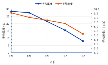 2023 年 7―11 月,余熱回收系統(tǒng)蒸汽平均流量隨平均溫度變化趨勢(shì)見圖 3。7―11 月平均氣溫從28.5 ℃降低至 8 ℃,蒸汽平均流量從 9.57 t/h 降低至7.15 t/h,由變化趨勢(shì)可知,環(huán)境溫度的變化會(huì)直接影響余熱回收效率。夏季環(huán)境溫度高時(shí),余熱回收系統(tǒng)回收蒸汽流量大;冬季環(huán)境溫度低時(shí),冷床棒材釋放的熱量一部分被冷空氣帶走,降低了取熱器吸收的熱量,系統(tǒng)回收蒸汽流量隨之減小。