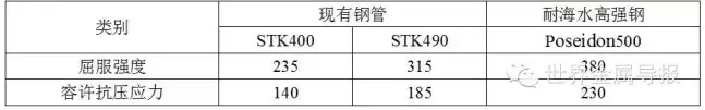 將Poseidon500應(yīng)用于棧橋碼頭,與現(xiàn)有的STK400和STK490鋼管進(jìn)行比較試驗(yàn)。結(jié)果顯示,在正常條件下,如果采用Poseidon500,容許應(yīng)力增加。經(jīng)過(guò)計(jì)算,與現(xiàn)有鋼管相比,Poseidon500鋼的容許抗壓應(yīng)力提高了24%-64%,見(jiàn)表3。