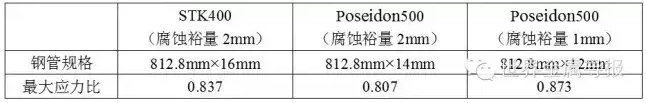 對(duì)于Poseidon500鋼,采用腐蝕裕量為2mm時(shí),鋼管規(guī)格為812.8mm×14mm;采用腐蝕裕量為1mm時(shí),鋼管規(guī)格為812.8mm×12mm(表4)。如果采用812.8mm×14mm的Poseidon500鋼管替代812.8mm×16mm的STK490鋼管,鋼材重量可減少12%,可節(jié)省原材料費(fèi)用。