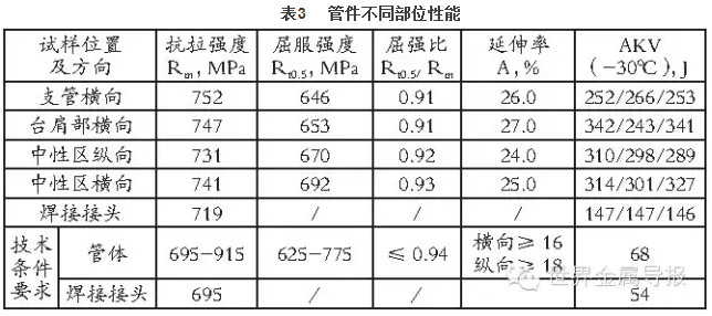 分別在三通管件的支管、管肩、主管、焊縫等部位進(jìn)行取樣,并依據(jù)ASTM A370《鋼鐵產(chǎn)品力學(xué)性能試驗(yàn)方法和定義》標(biāo)準(zhǔn)對(duì)管件進(jìn)行取樣、制樣并進(jìn)行力學(xué)性能檢測(cè),結(jié)果見表3所示:結(jié)果表明,經(jīng)成型及熱處理后,管件各部位均獲得很高的強(qiáng)度和低溫韌性配合,滿足X90管件技術(shù)要求,尤其值得一提的是,-30℃溫度下的管體沖擊功均大于250J。表明該管件具有高強(qiáng)度高低溫韌性配合。