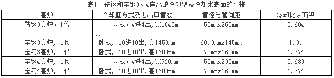 是什么原因造成這么大的差別?寶鋼3、4高爐其操作水平、冶煉強度、用料結(jié)構(gòu)及穩(wěn)定性、施工質(zhì)量等可以說應(yīng)當是相同的,國內(nèi)外屬一流,也找不出不足之處。差在什么地方?表1中列出三座高爐的冷卻壁結(jié)構(gòu)及冷卻比表面積