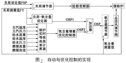 其中,鍋爐實(shí)時(shí)等效熱效率采用正平衡法進(jìn)行計(jì)算,氧含量設(shè)定值為負(fù)荷- 氧量設(shè)定器的輸出與氧含量優(yōu)化控制器的輸出之和。通過氧含量調(diào)節(jié)器輸出控制送風(fēng)閥,實(shí)現(xiàn)燃燒過程的優(yōu)化和閉環(huán)控制。