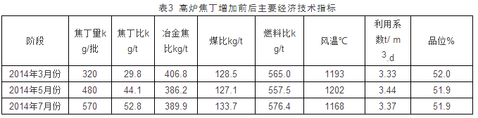 從上表3可見,焦丁入爐對降低焦比、燃料比有明顯的效果。