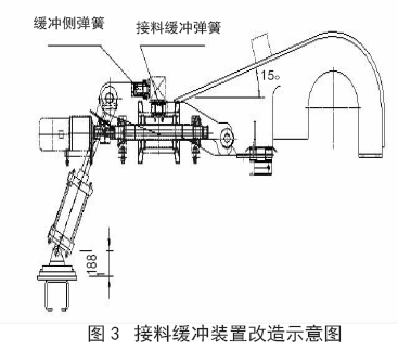 接料裝置由接料臂、頂升氣缸組成。由于氣缸直接安裝在基礎(chǔ)上,接料臂無緩沖彈簧,氣缸連接銷耳極易被沖擊負(fù)荷擊斷,造成故障。根據(jù)現(xiàn)場設(shè)備受力分析,對接料托臂進行改造,增加4 組箱型緩沖彈簧,分別吸收正向、側(cè)向坯料落下沖擊載荷,減少勢能對氣缸連接銷耳沖擊。氣缸底座利用現(xiàn)場基礎(chǔ),將原板式結(jié)構(gòu)設(shè)計為直角型,分解部分沖擊力對基礎(chǔ)造成的損壞,接料托臂改造見圖3。