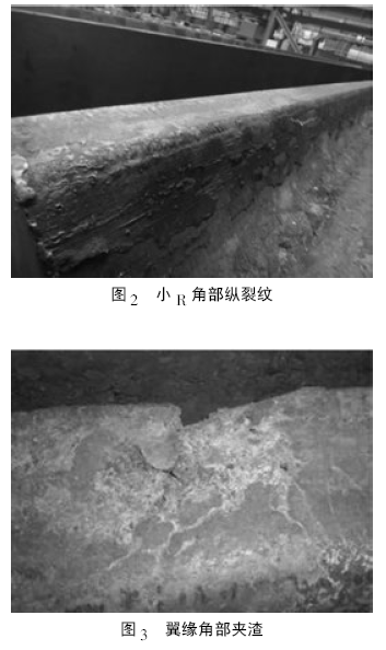 ⑵?。?角部縱裂紋形成原因。小R 角部是二維冷卻,最早形成氣隙而脫離銅板表面,由于斷面的復(fù)雜性翼緣肩角處保護(hù)渣熔化困難,液渣難以完全填充角部氣隙而使角部冷卻條件變差,同時由于兩個臨面的收縮使?。?角處應(yīng)力集中而產(chǎn)生縱裂或凹陷。
