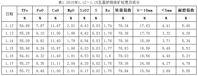 2015年1月15日白班接班槽存量大燒為3400t,小燒為1100t,大、小燒配比分別為52%、18%(五號高爐燒結(jié)礦粒度及成分見表1),布料制度為C876541 332223OL87654 34321.5OS98 22。高爐爐況穩(wěn)定順行,風(fēng)量6000-6100 m3/min,風(fēng)量、風(fēng)壓匹配良好,下料平穩(wěn)無滑料等異常情況;但3號鐵口工作不正常,3號鐵口深度只有正常深度的70%,且該鐵口底子硬,難以及時打開鐵口,造成渣鐵排放不干凈,3號鐵口堵口后風(fēng)壓上升,風(fēng)量小幅波動,通過合理安排1號鐵口的開鐵口時間,保證1號鐵口能出凈渣鐵,未造成爐況大幅波動。該日白班槽上更換小燒皮帶,燒結(jié)上料不分級,大、小燒混上,當(dāng)時認(rèn)為小燒配比減少后只會發(fā)展邊緣煤氣流,不會對爐況帶來大的影響,對小燒使用量的減少帶來的影響估計(jì)不足,就沒有對布料制度進(jìn)行調(diào)整,實(shí)際效果剛好相反,促進(jìn)了本次爐況波動的加劇。另外,3號鐵口較長時間不正常,邊緣氣流過旺導(dǎo)致鐵口維護(hù)難度進(jìn)一步加大,引起的3場渣鐵排放不順,在此次取消大、小燒分級的前期沒有充分考慮周全。