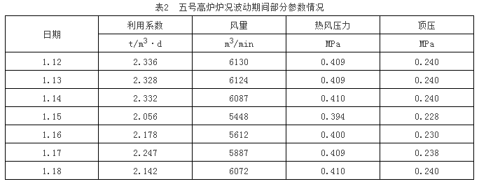 燒結(jié)槽存消耗完之前,高爐沒有調(diào)整相應(yīng)的裝料制度和配比。白班后期大、小燒結(jié)分級料的槽存剩余不多,小燒槽存量不足時,調(diào)整裝料制度為C876541332223OL87654 33321OS98 22,調(diào)整大、小燒配比分別為59%、13%。此時3號鐵口又出現(xiàn)堵口冒泥,鐵口通道遭到進(jìn)一步破壞,導(dǎo)致3號鐵口出鐵量多次不足500t(正常情況下的出鐵量在700t左右),憋爐加劇。導(dǎo)致五號高爐爐況在15日、16日出現(xiàn)波動,風(fēng)壓風(fēng)量不匹配、熱風(fēng)壓力波動大,風(fēng)量大幅萎縮,同時出現(xiàn)頻繁滑料現(xiàn)象,風(fēng)量最少時只有5100 m3/min左右(五號高爐正常風(fēng)量在6100m3/min),高爐被迫進(jìn)行退頂壓、降低壓差操作。這次爐況波動前后的部分參數(shù)見表2。