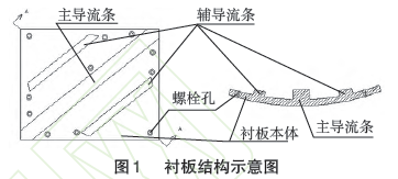 2)改造襯板的結構形式。原有的襯板為平板式、光面,易粘料。改造后的襯板設計有一個主導流條和兩條輔導流條。主導流條為“一”字形,設置在襯板的對角線位置。輔導流條為“一”字形,設置在主導流條的兩側,對稱分布。圖1 為襯板結構示意圖。