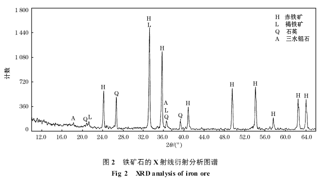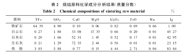 顯微結(jié)構(gòu)觀察(圖1)和X 射線衍射(圖2)分析結(jié)果表明, 本次試驗采用的鐵礦石是一種鏡鐵礦, 其主要物質(zhì)組成(質(zhì)量分數(shù), %)為鏡鐵礦65.9 , 半假象、假象赤鐵礦21.3 。燒結(jié)原料的化學成分分析結(jié)果見表2 , 原料配比見表3 。