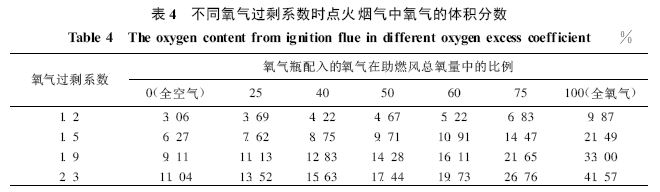 試驗采用天然氣作為點火的燃料, 空氣或者空氣和氧氣的混合氣體作為助燃風。為了得到高的燃燒溫度, 氧氣過剩系數(shù)要大于1.0 , 以保證完全燃燒,但應該盡可能減小氧氣過剩系數(shù)。從表4 可以看出, 要想增大煙氣中氧氣的含量又不讓氧氣過剩系數(shù)太高, 唯一的辦法是在空氣中配入一定量的氧氣。換言之, 為提高燃燒溫度, 增加煙氣中氧氣的含量,又能減小氧氣過剩系數(shù), 采用富氧進行點火是有效而唯一的選擇。
