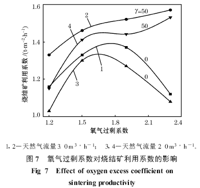 從圖7 可以看出, 在空氣作為助燃風時, 隨著氧氣過剩系數(shù)的增大, 煙氣中的氧氣含量有所提高, 適當提高氧氣過剩系數(shù)可以提高燒結(jié)礦的利用系數(shù),但進一步提高氧氣過剩系數(shù), 使點火的溫度降低, 同時煙氣總量增加造成廢氣攜帶的熱量也增加, 以致于燒結(jié)礦的利用系數(shù)出現(xiàn)先升后降的趨勢。然而把γ提高到50 %, 燒結(jié)礦的利用系數(shù)則隨著氧氣過剩系數(shù)的增大而得到提高, 只是上升的幅度越來越小。從圖7 可以看出, 助燃風中配入一定量的氧氣, 是非常有必要的, 但γ值在50 %以下可有明顯效果, 再提高富氧程度, 效果便越來越不明顯。同時可以看出,在助燃風中配入一定量的氧氣后, 在較低的燃料用量下就能正常進行點火, 而且與空氣作為助燃風的情況相比, 燒結(jié)礦的生產(chǎn)率得到明顯提高。在天然氣流量為3m3 · h-1 , 空氣作為助燃風, α為1.9 時,燒結(jié)礦的利用系數(shù)為1.37 t · m-2 · h-1 ;當γ值提高到50 %, 天然氣流量降低到2m3 · h-1 , α為1.9時, 燒結(jié)礦的利用系數(shù)提高到1.44 t ·m-2 · h -1 。