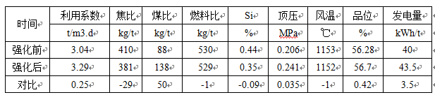高爐爐頂壓力提高后,TRT發(fā)電量也比原來有了很大的提高,強化冶煉前,高爐TRT發(fā)電量是40 kWh/t,高爐強化后,TRT發(fā)電量達到43.5 kWh/t,提高了3.5 kWh/t。
