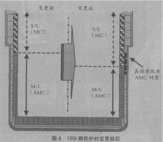 開爐時150t 鋼包的使用壽命僅為80t 鋼包的五分之一,多次發(fā)生M/L 磚全部重換的爐次,其大部分是磚熔蝕。因此,為了降低鋼包爐襯的熔蝕。提高使用壽命,對操作條件和耐火材料兩方面都進行了改善。