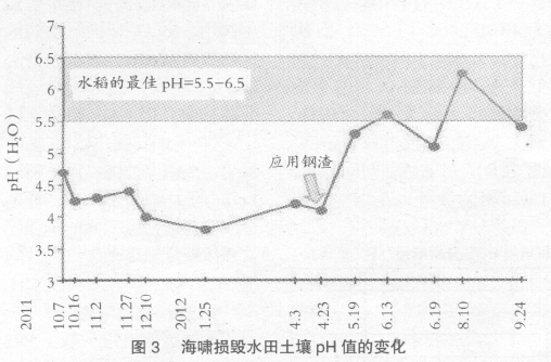 東日本大地震使許多農(nóng)田被海嘯損毀,宮城縣有約15000 公頃,福島縣約5900 公頃農(nóng)田受災(zāi)。以鋼渣為原料的肥料含CaO 多,通過(guò)海水使吸附在土壤顆粒的鈉離子(Na+)與肥料供給的鈣離子(Ca2+)交換,期待促進(jìn)除鹽。此外,海嘯堆積土中因黃鐵礦(FeS2)氧化,產(chǎn)生硫酸使土壤酸性化。這時(shí),有望用以鋼渣(含有CaO)為原料的肥料的堿性來(lái)抑制黃鐵礦(FeS2)的氧化,從而改良土壤的pH 值。有研究者于2012 年4 月在福島縣相馬市的海嘯損毀水田的酸性化土壤中,施用以鋼渣為原料的肥料,試驗(yàn)栽培了水稻。圖3 是施用以鋼渣為原料的肥料前后的水田土壤中pH 值的變化。通過(guò)在酸性化pH=4 的水田土壤中施用以鋼渣為原料的肥料,土壤改良為適合栽培水稻的pH 值(約5.5)。水稻順利生長(zhǎng),收獲與常年一樣。