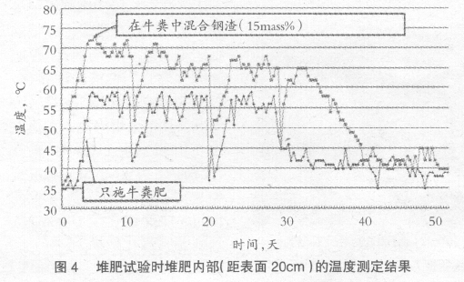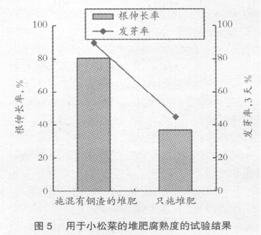 家禽畜糞便形成的堆肥可以作為含有N、P 的肥料利用。在家禽畜糞便中混合鋼渣,制或除含有N、P 外,還含有Ca、Si、Mg、Mn、Fe 等成分的堆肥。在牛糞中混合15%的鋼渣與不混合鋼渣制堆肥的試驗(yàn)中,在距堆肥表面20cm 深處測(cè)定的溫度變化示于圖4。混合鋼渣時(shí),溫度約上升到70℃,而不混合鋼渣時(shí)只上升到58℃。每10 天進(jìn)行翻動(dòng)時(shí),溫度暫時(shí)下降,但其后再次上升。混合鋼渣時(shí),堆肥內(nèi)部溫度保持在65-70℃,所以認(rèn)為短時(shí)期可以堆肥化。圖5 是將制作的堆肥用于小松菜后,堆肥腐熟度的調(diào)查結(jié)果。