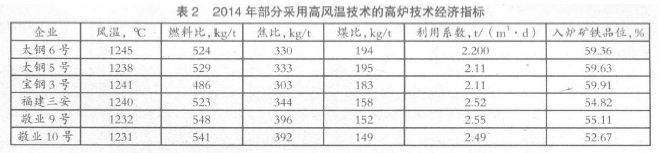 據(jù)統(tǒng)計,2014 年我國有71 座高爐年平均風溫超過1200℃,最高的是太鋼6 號高爐,風溫達到1245.28℃,寶鋼3 號高爐風溫達到1241℃,福建三安5 號高爐為1240℃;敬業(yè)9 和10 號高爐、寶鋼2 號高爐、太鋼5 號高爐等的風溫均超過1230℃,具體見表2。