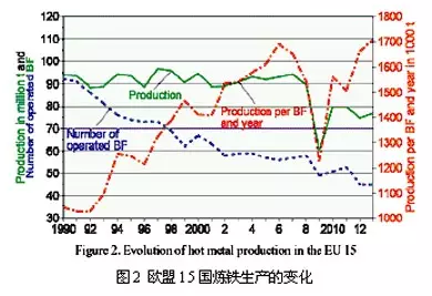 生產(chǎn)狀況。歐盟15國的生鐵產(chǎn)量已從2008年前的年產(chǎn)9000多萬噸下降到近幾年的不足8000萬噸,見圖2(2013年7690萬噸)。高爐運行數(shù)量由1990年的92座降低到目前的45座,但單爐產(chǎn)量則由104萬噸/年提高到目前的171萬噸/年。