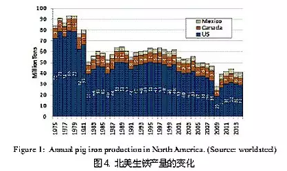 生產(chǎn)情況。在過去的40年里,北美的生鐵產(chǎn)量逐漸降低,見圖4,2014年為4200萬噸。其主要競爭者是廢鋼電爐生產(chǎn)流程。電爐鋼占半數(shù)以上,鐵鋼比僅為0.4。