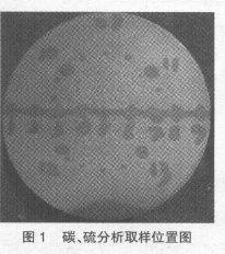 2)碳、硫紅外分析:在酸浸后的低倍試樣上(取樣前將表面的酸浸部分剔除),以圓點(diǎn)為中心、在任意直徑方向上每隔10mm 用直徑5mm 鉆頭取屑樣2-3g,樣品編號(hào)1-9 號(hào),其中5 號(hào)為中心;另在該直徑兩旁柱狀晶與等軸晶交界處(CET)取4 點(diǎn),樣品編號(hào)10-13 號(hào),每片試樣共取13 個(gè)點(diǎn)(如圖1),采用CS-444 紅外碳、硫氣體分析儀按GB/T20123 標(biāo)準(zhǔn)進(jìn)行碳、硫含量測(cè)定。