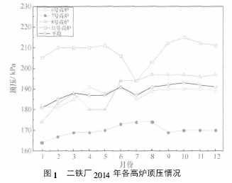 高壓操作是提高產(chǎn)量、降低綜合焦比的一項重要措施,部分高爐受到原燃料條件和爐頂設(shè)備老化的因素影響,二鐵廠針對該系列問題對頂壓進(jìn)行了多個步驟逐步提高: 1) 全面檢查爐頂設(shè)備,減少“跑冒滴漏”發(fā)生. 2) 進(jìn)行下部風(fēng)口調(diào)節(jié),穩(wěn)步縮小風(fēng)口面積,通過多次休風(fēng)機(jī)會,將風(fēng)口面積逐步降低,并適當(dāng)提高風(fēng)口標(biāo)準(zhǔn)風(fēng)速,減少邊緣氣流過分發(fā)展的可能性. 3) 配合風(fēng)口面積縮小,鼓風(fēng)動能得到提高,逐步對4 座高爐取消中心加焦. 圖1 為2014 年4 座高爐頂壓水平.