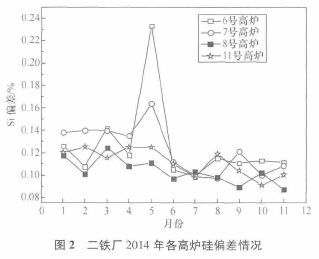 生鐵含硅量是評價高爐鐵水質(zhì)量和冶煉技術(shù)水平的重要指標(biāo)之一,而且由于Si 還原需要消耗大量熱量,故鐵水中[Si]含量越高,消耗的焦炭和噴吹煤就越多,在操作上實現(xiàn)低硅冶煉操作也是節(jié)能降耗的重要途徑之一. 二鐵廠一方面通過加強(qiáng)對各高爐工長培訓(xùn),改變工長的部分操作習(xí)慣,比如將噴煤控制中小時噴煤量計算方法變?yōu)樾r燃料比計算,確保每小時燃料比穩(wěn)定,再強(qiáng)化工長對爐溫的監(jiān)控,減少高爐溫出現(xiàn); 另一方面采取合適的造渣制度,適當(dāng)提高爐渣堿度來抑制Si 還原; 此外確保料線正常,杜絕低料線操作. 通過相應(yīng)的低硅冶煉,二鐵廠2014 年燃料能耗大幅度下降. 圖2 為2014 年各高爐硅偏差情況.